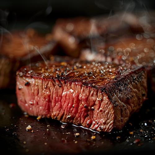 Закончив приготовление, перекладываем говядину на разделочную доску, укутываем её в фольгу и оставляем отдыхать на 10 минут. Нарезаем бифштекс поперек волокон и подаём с любым выбранным гарниром.