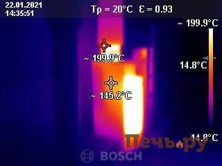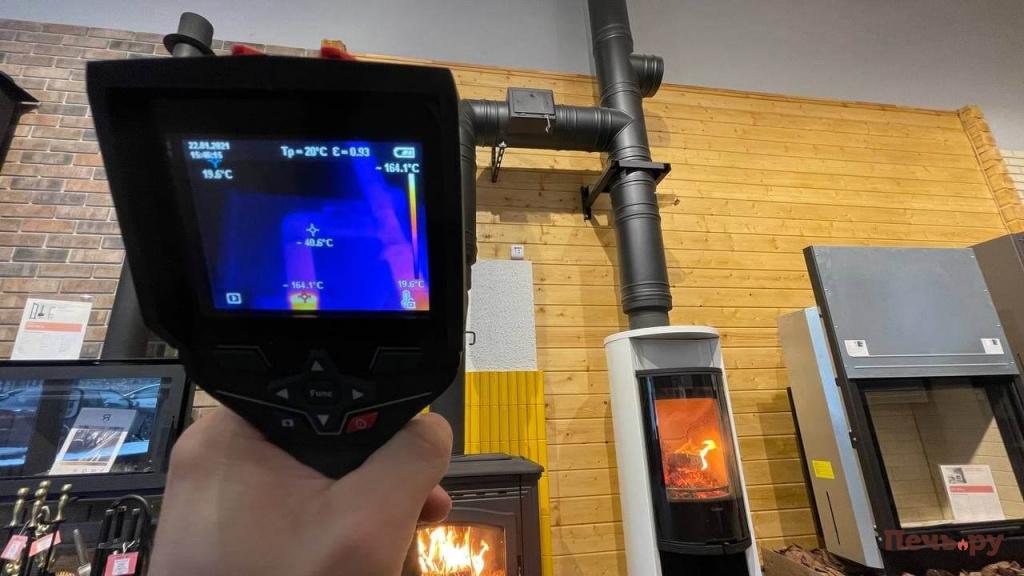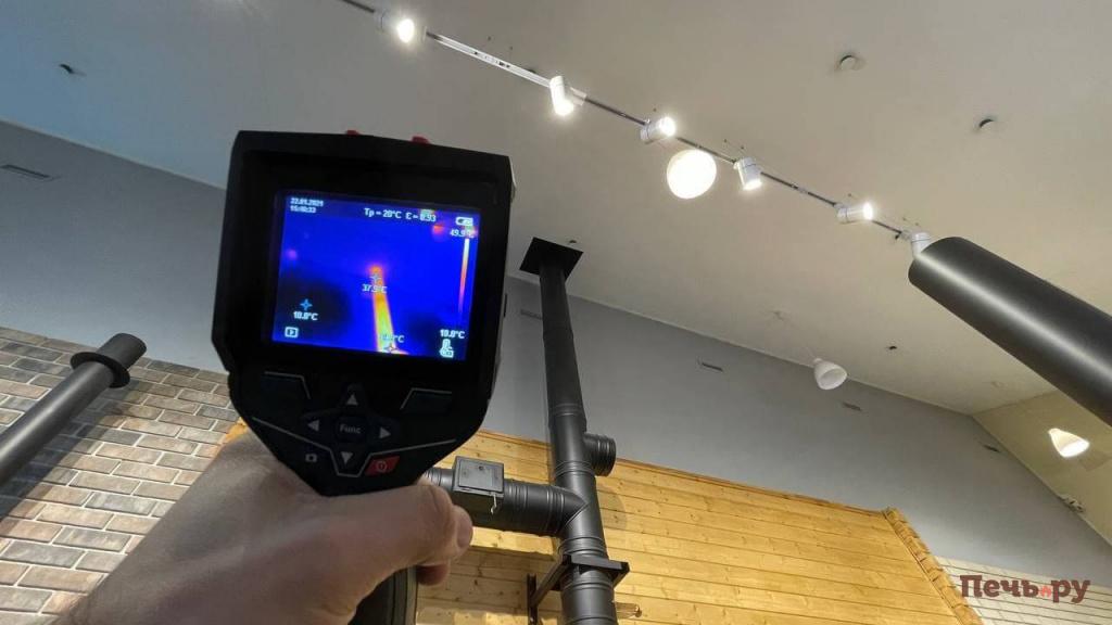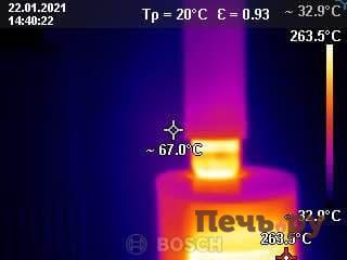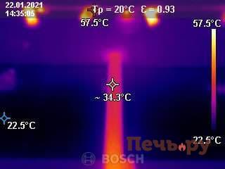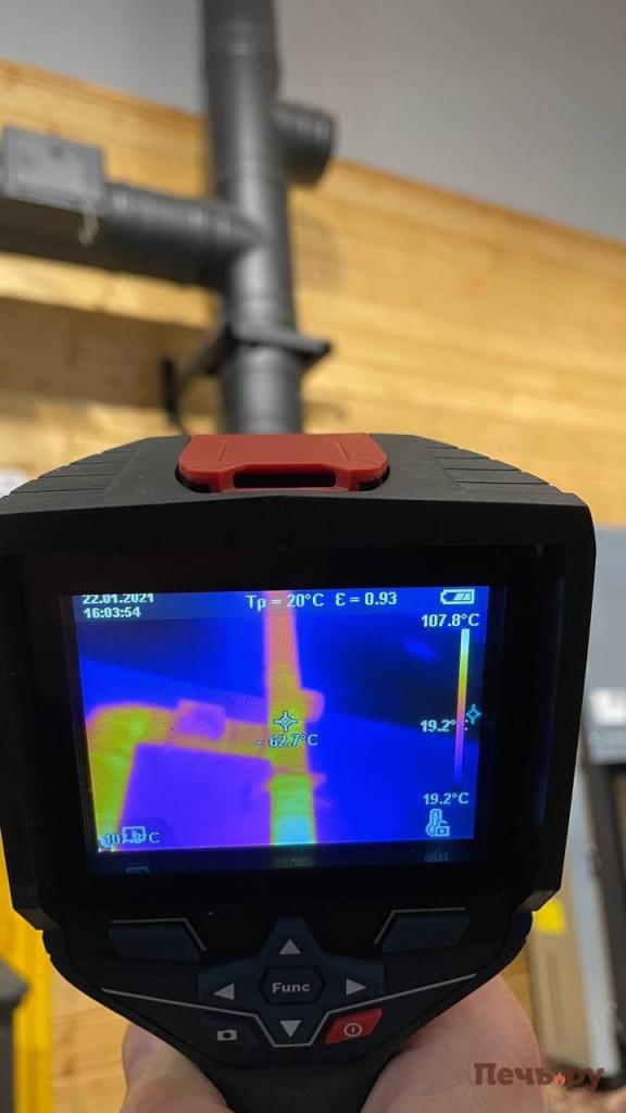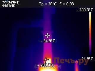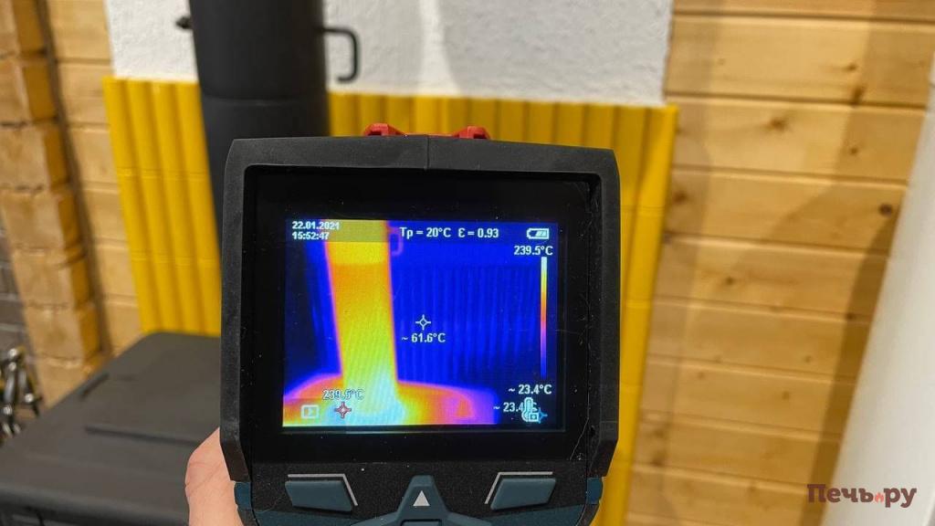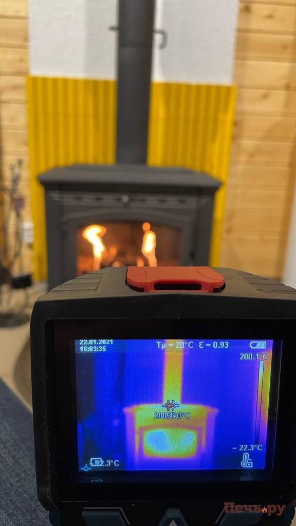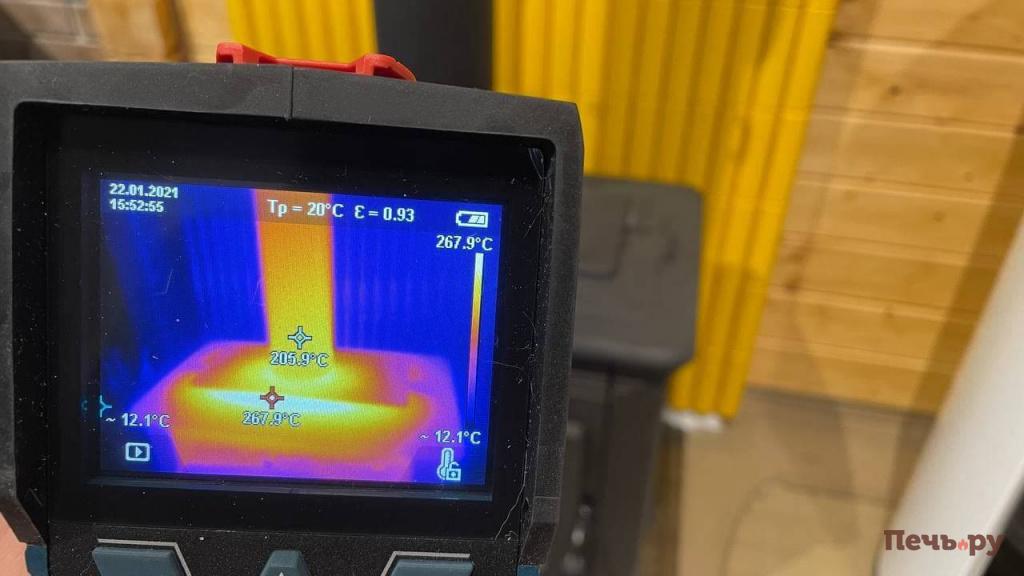 В то же время чугунная Plamen Tena раскалилась до 260 С и прогрела плитки пола до 60 С. Сэндвич-панели под потолком прогрелись до 50 С.